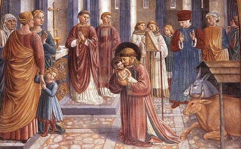 Al rededor de un pesebre, con la figura del Niño Jesús, moldeado por las manos de San Francisco, se cantaron alabanzas al «misterio del Nacimiento»; en el momento más solemne de la misa, según la tradición, aquella figura inmóvil adquirió vida, sonrió y extendió sus brazos hacia el Santo de Asís.